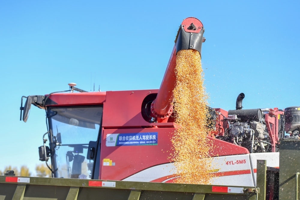 在中國科學(xué)院“黑土糧倉”科技會戰(zhàn)長春示范區(qū)公主嶺示范基地,無人駕駛農(nóng)機將收獲的玉米裝車(2023年10月19日攝)。新華社記者 張楠 攝