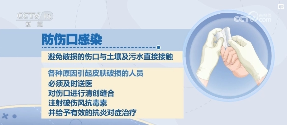 如果有受傷的情況,應(yīng)避免破損的傷口與土壤及污水直接接觸。各種原因引起皮膚破損的人員必須及時(shí)送醫(yī),對(duì)傷口進(jìn)行清創(chuàng)縫合、注射破傷風(fēng)抗毒素,并給予有效的抗炎對(duì)癥治療。
