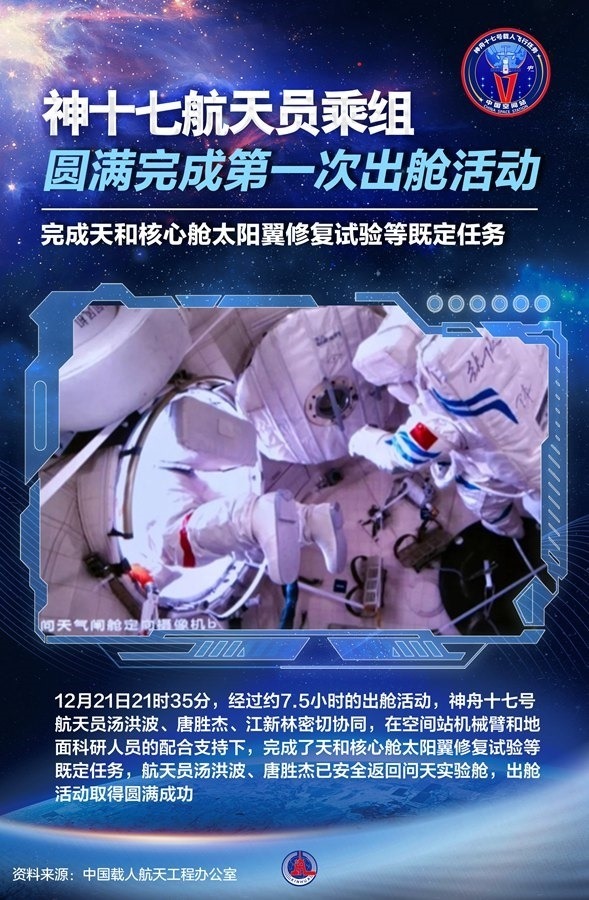 據(jù)中國載人航天工程辦公室介紹,21日21時35分,經(jīng)過約7.5小時的出艙活動,神舟十七號航天員湯洪波、唐勝杰、江新林密切協(xié)同,在空間站機械臂和地面科研人員的配合支持下,完成了天和核心艙太陽翼修復(fù)試驗等既定任務(wù),航天員湯洪波、唐勝杰已安全返回問天實驗艙,出艙活動取得圓滿成功。