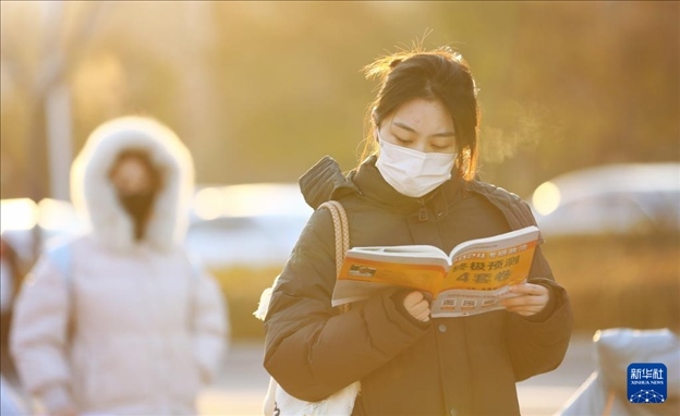 12月23日,在山東省煙臺市萊山一中考點(diǎn)外,考生抓緊時(shí)間復(fù)習(xí)。