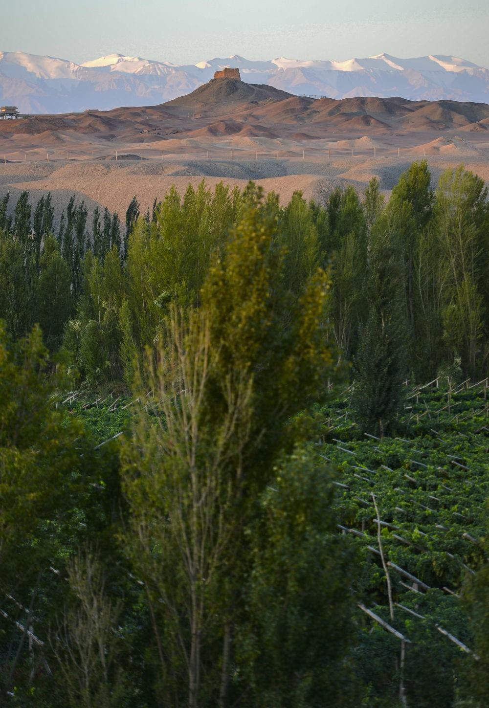 甘肅省敦煌市陽關遺址前的綠洲(2013年9月5日攝)。
