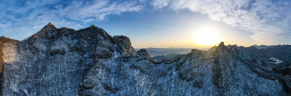 夕陽下的北京箭扣長城(無人機全景照片,2023年2月13日攝)。
