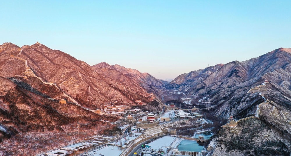 朝陽灑在雪后的居庸關長城上(無人機照片,2023年12月16日攝)。