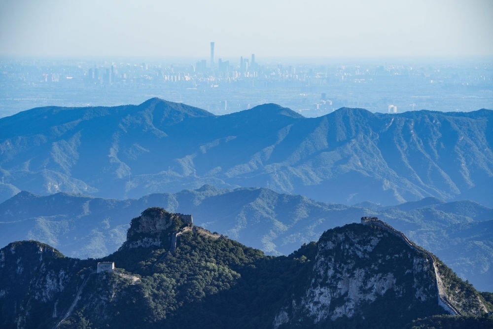 箭扣長城和遠處北京城區(qū)的建筑群(2022年9月5日攝)。