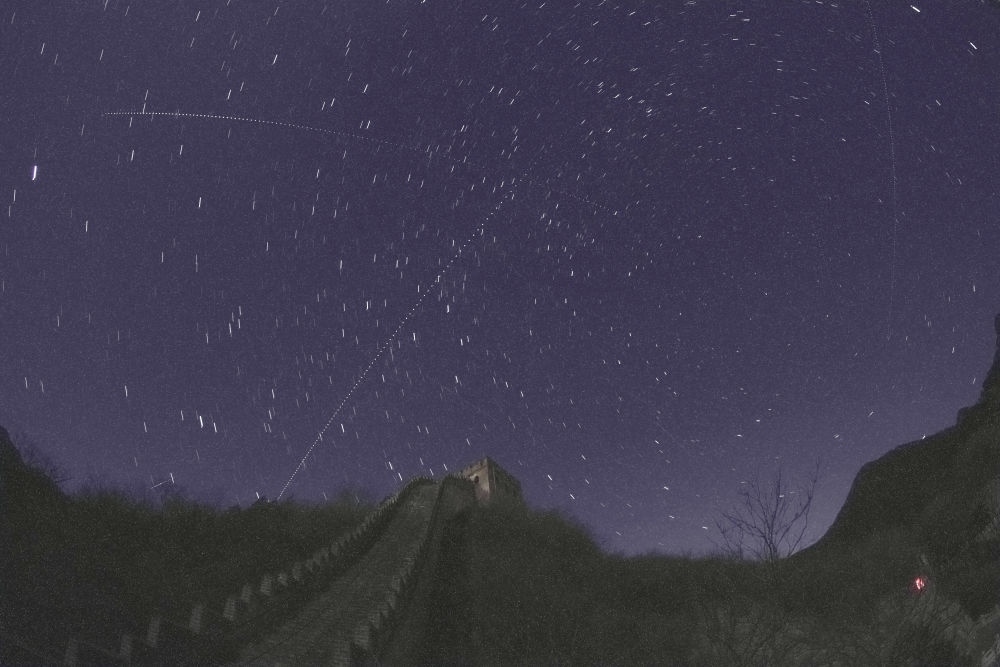 在北京延慶水關長城拍攝的中國空間站過境照片(從左下向右上的軌跡為中國空間站,軌跡為多張照片堆棧,2021年12月12日攝)。