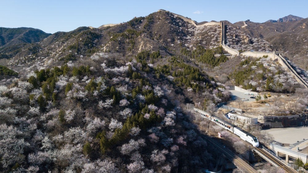 一列火車在北京水關長城附近的山花中穿行(無人機照片,2020年3月27日攝)。