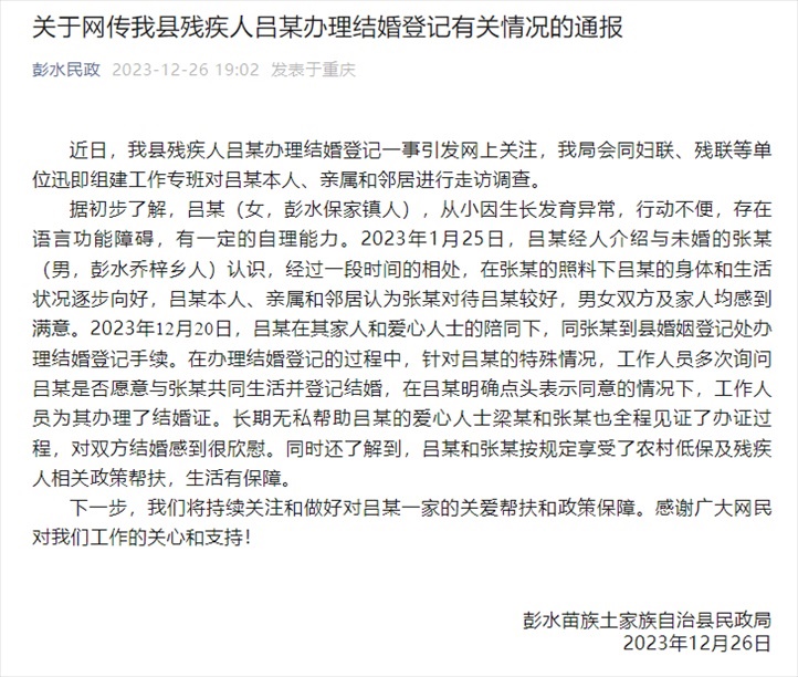 ·重慶彭水通報(bào)“23歲疑似智力障礙女子與五旬男子結(jié)婚”。