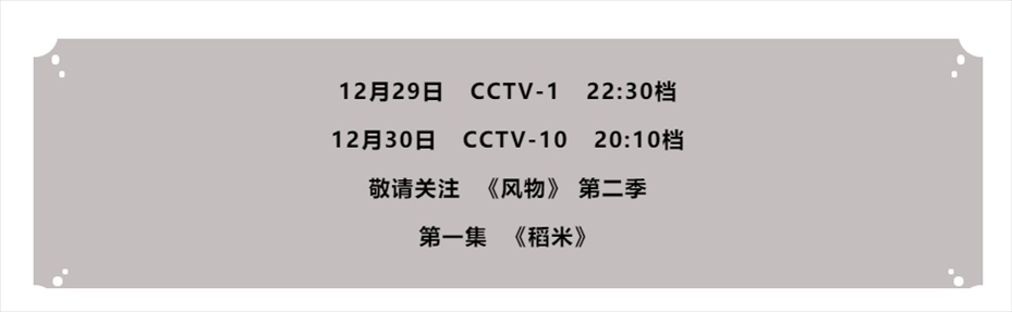 2023年12月29日起,紀錄片《風(fēng)物》(第二季)的七期節(jié)目將在央視綜合頻道CCTV-1 晚間 22:30檔,陸續(xù)播出。第二季節(jié)目秉持著《風(fēng)物》第一季的創(chuàng)作理念,用獨具特色的精美鏡頭、貫穿古今的風(fēng)物故事、地跨南北的格局視角,展現(xiàn)了中國大地獨具特色的風(fēng)物特產(chǎn)。節(jié)目以習(xí)近平文化思想為統(tǒng)領(lǐng),通過挖掘七種中華大地上最具代表性的時令特產(chǎn),展現(xiàn)其深層的文化邏輯、歷史根脈和生活智慧,以獨特的文化擔(dān)當、強烈的文化自信,生動描摹了一幅幅獨特鮮活的“中國風(fēng)物版圖”,打造了一部部影像版“國家風(fēng)物畫卷”,揭示了中華優(yōu)秀傳統(tǒng)文化中天人合一、萬物和諧共生的文化理念和價值追求。