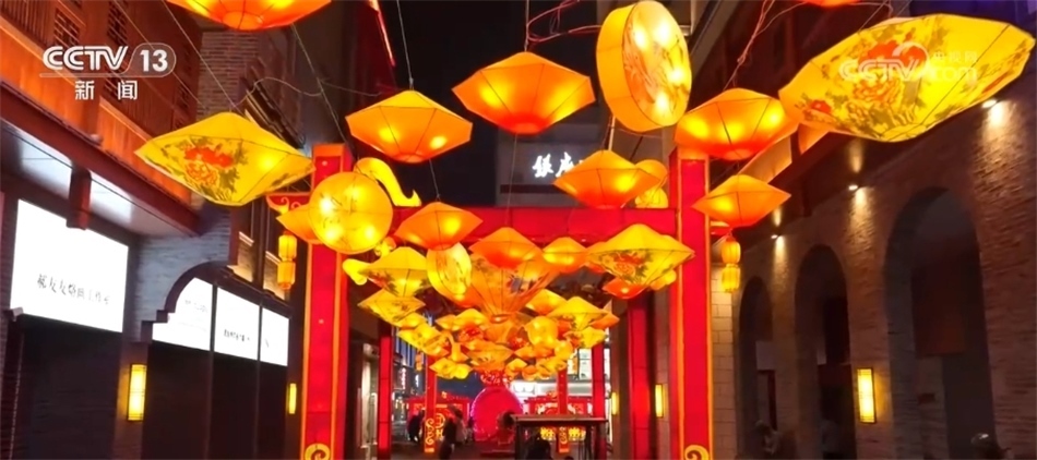 在江蘇南京熙南里街區(qū),大紅燈籠高高掛,來往游客和市民穿梭其間逛市集、品美食,感受節(jié)日氣氛。