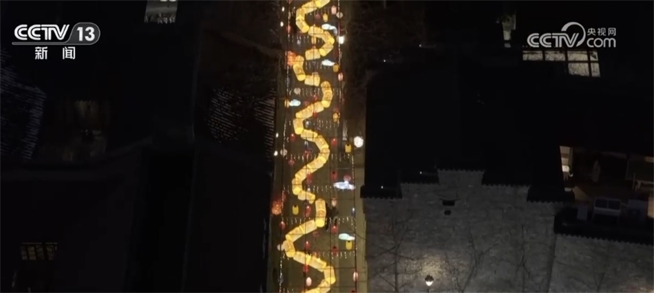 在老門東景區(qū),從空中俯瞰,一條長130多米的龍燈貫穿在巷子里,蜿蜒盤旋點亮了城市夜空。