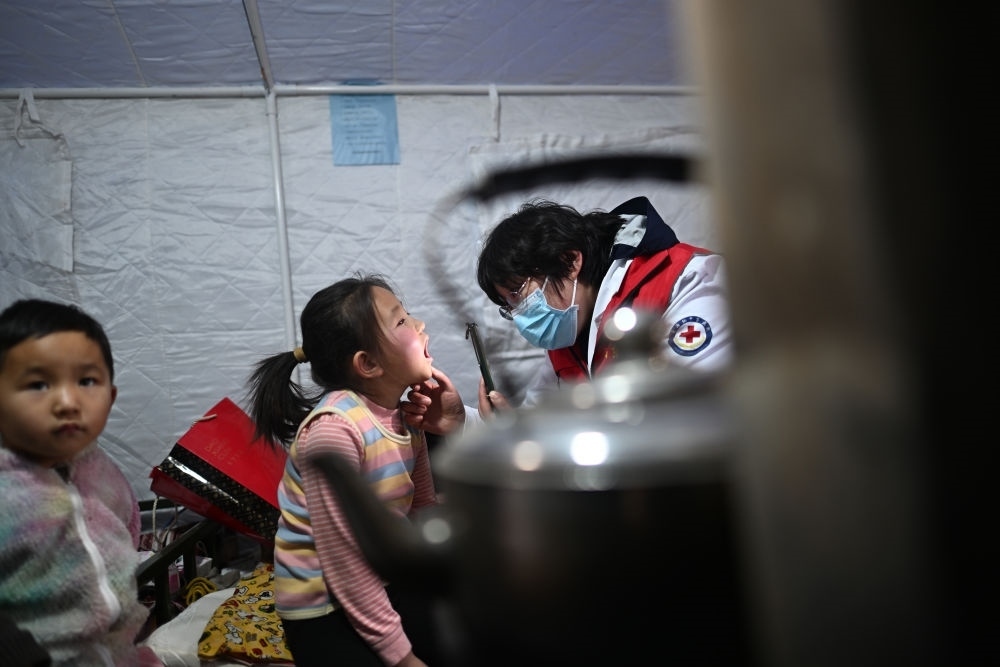 在青海省海東市民和回族土族自治縣官亭鎮(zhèn)喇家村安置點,山東援青醫(yī)生李鴻皓(右)為喇生婷檢查身體(12月23日攝)。積石山6.2級地震發(fā)生以來,在青海省海東市民和回族土族自治縣,當?shù)蒯t(yī)療機構和援青醫(yī)療隊通過設立醫(yī)療點、開展巡診等方式保障安置點群眾就醫(yī)服務,守護群眾健康。新華社記者 張宏祥 攝