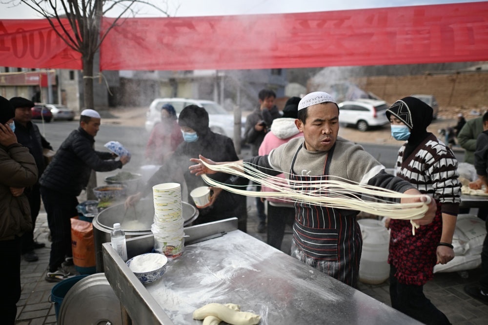 在青海省海東市民和縣官亭鎮(zhèn),一家拉面店店主不顧自家在地震中受損的店鋪,支起鍋灶為鄉(xiāng)親們免費提供拉面。這是店員和附近幫忙的村民在拉面攤上忙碌(12月20日攝)。新華社記者 張宏祥 攝