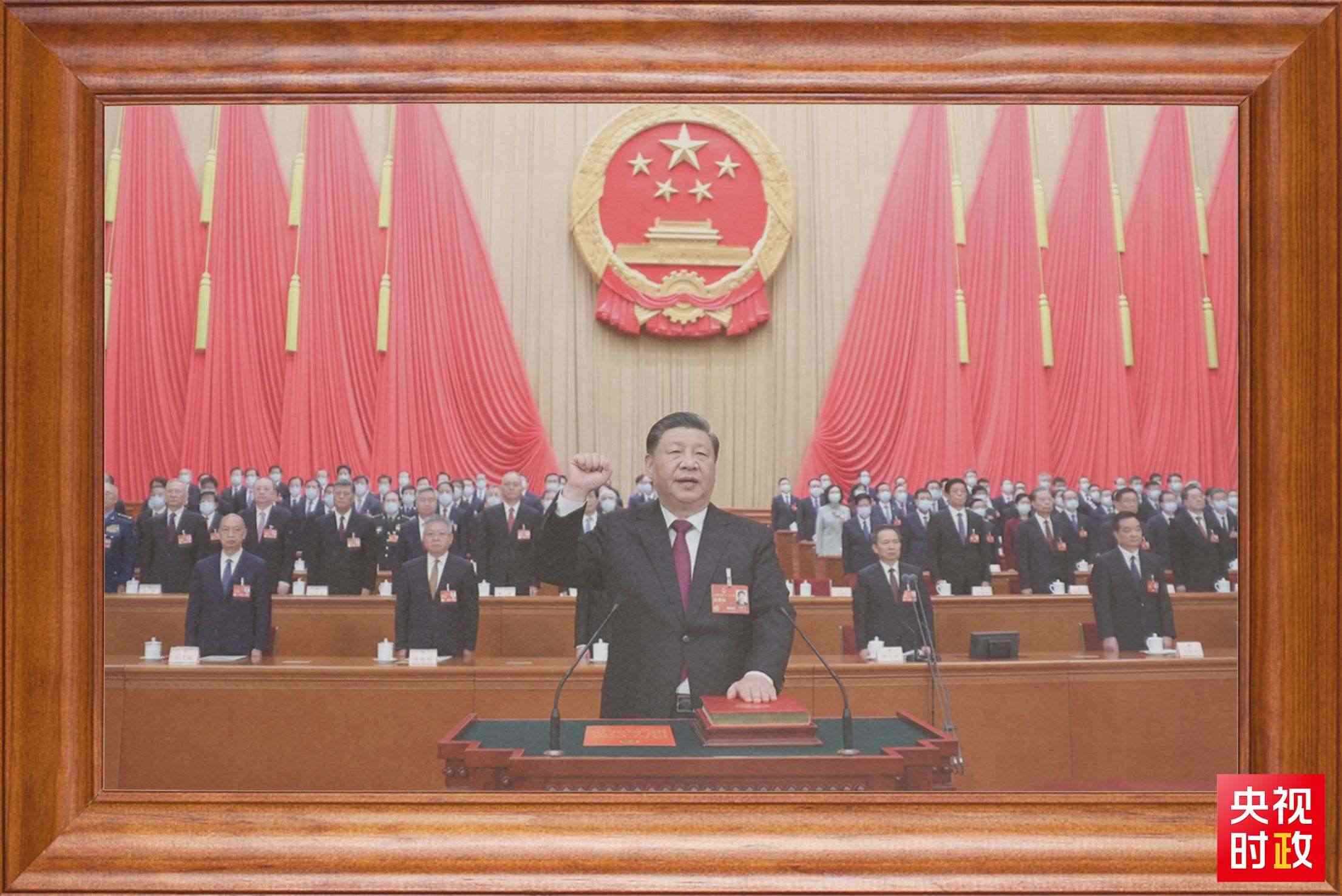 還有一張?zhí)貏e的照片。2023年3月10日,在北京人民大會(huì)堂,全票當(dāng)選國家主席、中央軍委主席的習(xí)近平,左手撫按《中華人民共和國憲法》,右手舉拳,面向近3000名全國人大代表,鄭重宣誓。