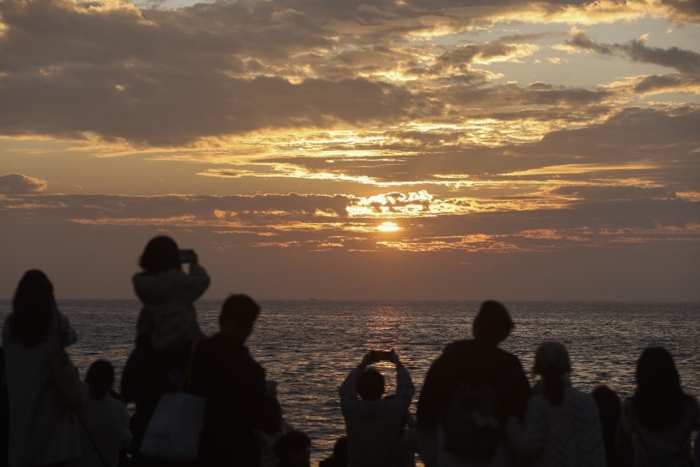 1月1日,人們在山東日照舉行的一場元旦迎日祈福儀式上觀看日出。新華社發(fā)(劉濤 攝)