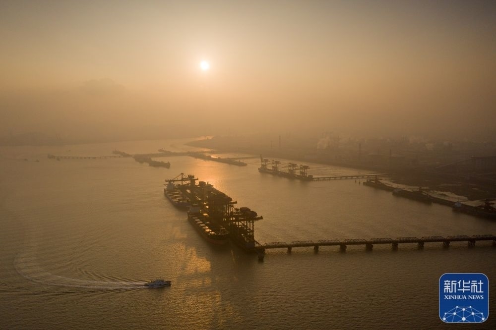 1月1日,在新年第一縷晨光里,浙江省寧波舟山港北侖港區(qū)礦石碼頭生產(chǎn)一派繁忙(無人機照片)。新華社發(fā)(蔣曉東 攝)