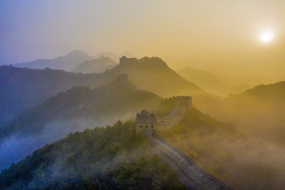 這是2023年11月1日拍攝的河北承德金山嶺長城日出景觀(無人機(jī)照片)。新華社發(fā)(周萬平 攝)