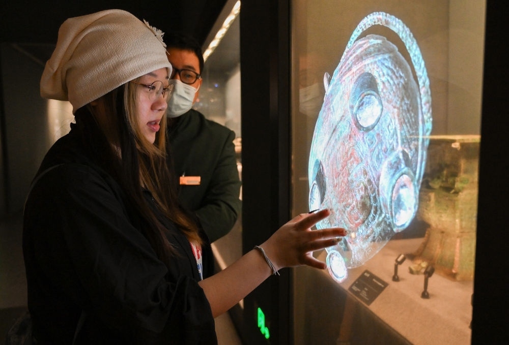 2023年9月15日,觀眾在位于北京奧林匹克公園核心區(qū)的中國考古博物館內(nèi)體驗(yàn)互動(dòng)屏幕。新華社記者 李賀 攝