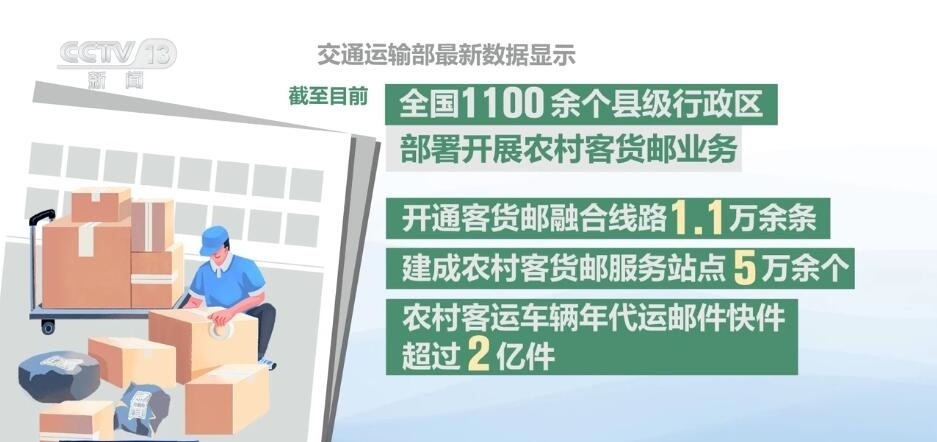 交通運(yùn)輸部最新數(shù)據(jù)顯示,截至目前,全國(guó)1100余個(gè)縣級(jí)行政區(qū)部署開(kāi)展農(nóng)村客貨郵業(yè)務(wù),開(kāi)通客貨郵融合線(xiàn)路1.1萬(wàn)余條,建成農(nóng)村客貨郵服務(wù)站點(diǎn)5萬(wàn)余個(gè),農(nóng)村客運(yùn)車(chē)輛年代運(yùn)郵件快件超過(guò)2億件。