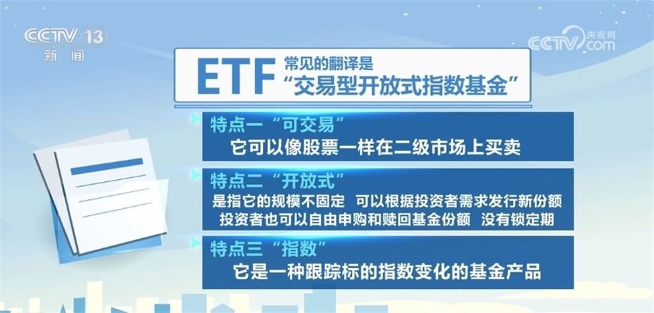ETF,常見(jiàn)的翻譯是“交易型開(kāi)放式指數(shù)基金”。從這個(gè)名字當(dāng)中,我們就能發(fā)現(xiàn)它的三個(gè)特點(diǎn):一是“可交易”,它可以像股票一樣在二級(jí)市場(chǎng)上買賣;二是“開(kāi)放式”,是指它的規(guī)模不固定,可以根據(jù)投資者需求發(fā)行新份額,投資者也可以自由申購(gòu)和贖回基金份額,沒(méi)有鎖定期;三是“指數(shù)”,它是一種跟蹤標(biāo)的指數(shù)變化的基金產(chǎn)品。
