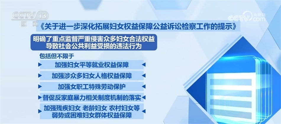 《工作提示》明確了重點監(jiān)督嚴(yán)重侵害眾多婦女合法權(quán)益導(dǎo)致社會公共利益受損的違法行為,包括但不限于:加強婦女平等就業(yè)權(quán)益保障,加強涉眾多婦女人格權(quán)益保障,加強女職工特殊勞動保護,督促反家庭暴力相關(guān)制度機制的落實,加強殘疾婦女、老齡婦女、農(nóng)村婦女等弱勢或困難婦女群體權(quán)益保障。同時,針對其他與眾多婦女權(quán)益密切相關(guān)的領(lǐng)域加強監(jiān)督。