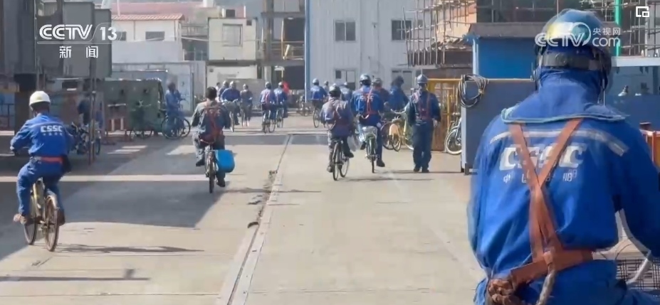 一輛輛各式各樣的自行車平穩(wěn)穿梭在安全區(qū),車上的工友有事兒就會互相召喚,拿出圖紙解決問題,互通有無。而在職工和船東餐廳里,一張張餐桌上分區(qū)標記了各個業(yè)主單位。吃完飯撤掉餐具,大家就開始“頭腦風暴”,現(xiàn)場辦公。