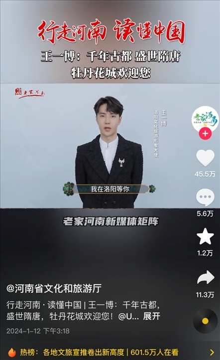 有人統(tǒng)計(jì),自1月9日起,河南文旅官方賬號(hào)“河南省文化和旅游廳”每天發(fā)布二三十條視頻,連續(xù)四天發(fā)布了112條視頻,持續(xù)展示本地文旅資源,吸引了近百萬(wàn)新粉絲,主打一個(gè)“量變總會(huì)引起質(zhì)變”,以至于“河南文旅到底發(fā)了多少抖音”相關(guān)話題成為熱門(mén)搜索。