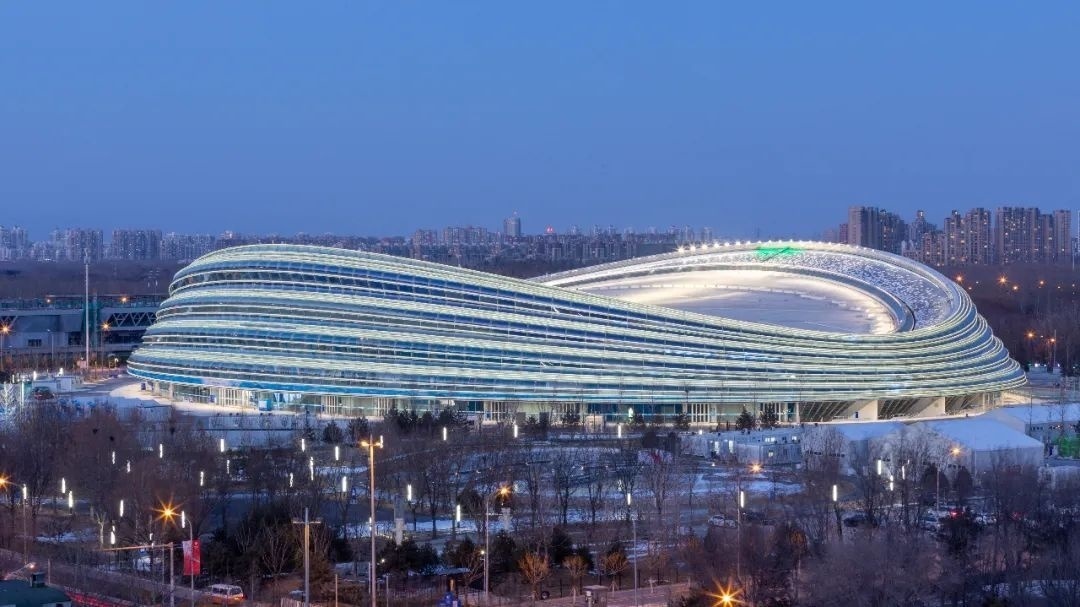 沿北京中軸線一路向北,空中俯瞰,國家速滑館宛若冰刀在冰面上刻下的晶瑩軌跡。它的另一個名稱“冰絲帶”,由此得名。