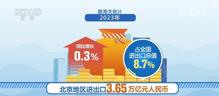 據(jù)海關(guān)統(tǒng)計(jì),2023年,北京地區(qū)進(jìn)出口3.65萬億元人民幣,同比增長0.3%,占全國進(jìn)出口總值的8.7%。