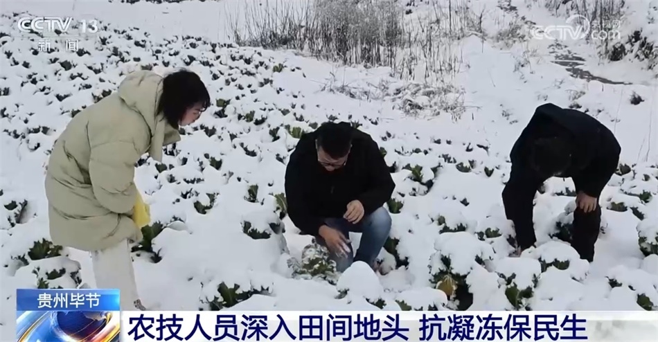 在貴州畢節(jié)螺絲村蔬菜基地,田間地頭白茫茫一片。為應(yīng)對低溫凝凍天氣,當(dāng)?shù)剞r(nóng)技人員現(xiàn)場查看蔬菜長勢,為農(nóng)戶講解蔬菜防凍知識,指導(dǎo)做好防寒抗凍措施。