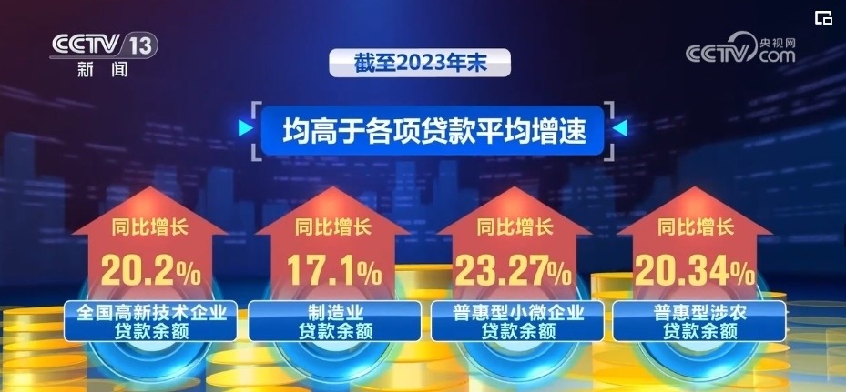 截至2023年末,全國高新技術(shù)企業(yè)貸款余額同比增長20.2%,制造業(yè)貸款余額同比增長17.1%,普惠型小微企業(yè)貸款余額同比增長23.27%,普惠型涉農(nóng)貸款余額同比增長20.34%,均高于各項(xiàng)貸款平均增速。