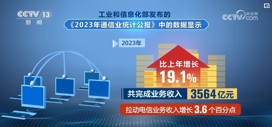 2023年,數(shù)據(jù)中心、云計算、大數(shù)據(jù)、物聯(lián)網(wǎng)等新興業(yè)務(wù)快速發(fā)展,共完成業(yè)務(wù)收入3564億元,比上年增長19.1%,拉動電信業(yè)務(wù)收入增長3.6個百分點(diǎn)。