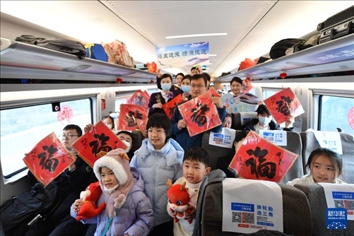 1月26日,在由南京南站發(fā)往太倉(cāng)的G8981次列車(chē)上,南京客運(yùn)段的工作人員與收到“福”字的旅客合影。新華社記者 柳文惠 攝