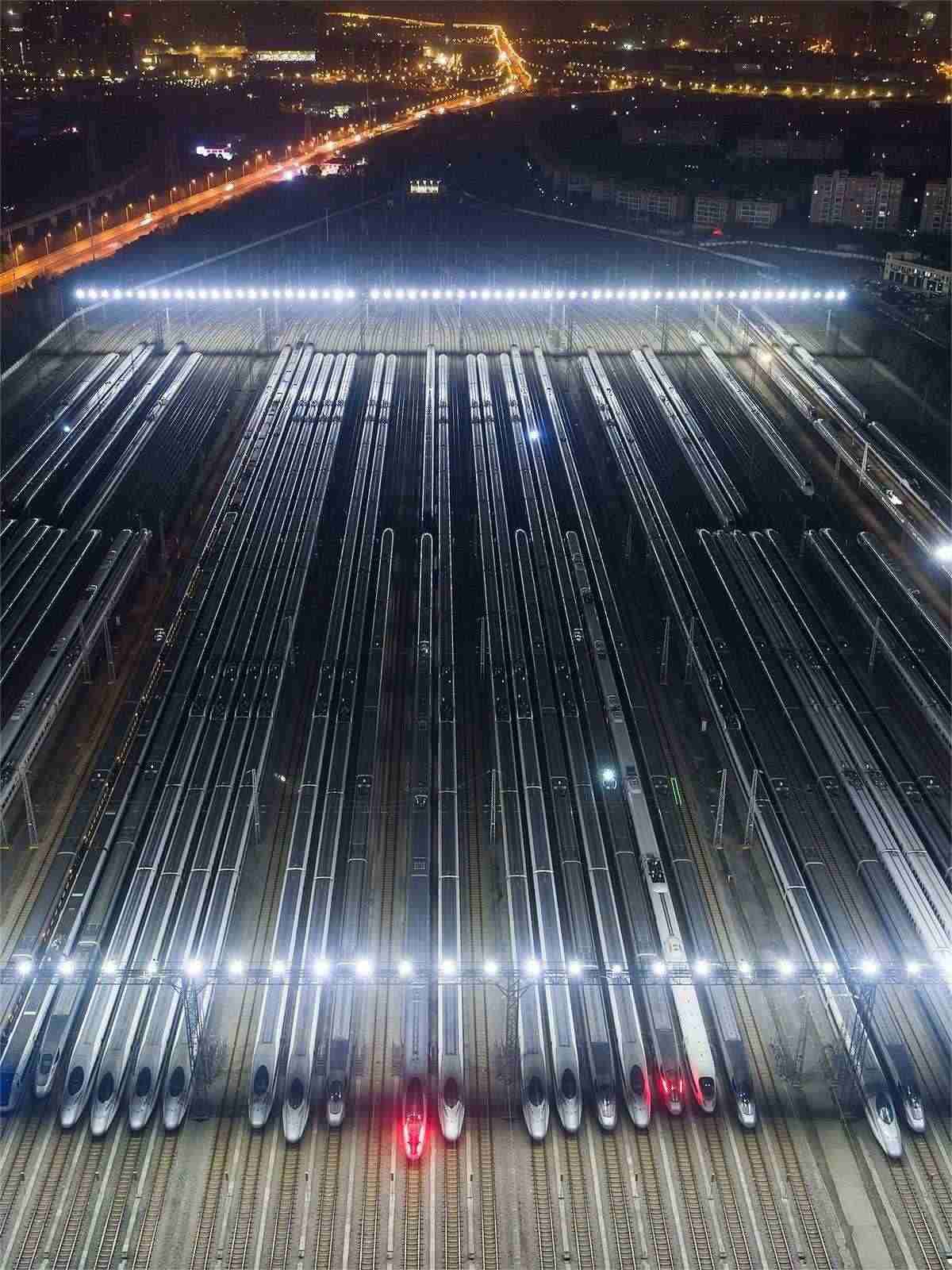1月26日凌晨1時許,春運前夜,在武漢動車段的存車線上,一列列完成檢修的動車組集結完畢,猶如“陸地航母”一般,蓄勢待發(fā),迎接春運。(湖北日報全媒記者 任勇 通訊員 許輝 劉博洋 攝)
