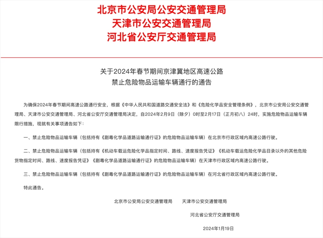 北京市公安局公安交通管理局、天津市公安交通管理局、河北省公安廳交通管理局決定,自2024年2月9日(除夕)0時至2月17日(正月初八)24時,實施危險物品運輸車輛限行措施,現(xiàn)就有關(guān)事項通告如下: