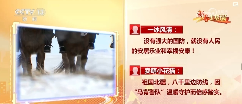 《新春走基層·馬背警隊:風雪中的溫暖守護》播出后,有網(wǎng)友說:“沒有強大的國防,就沒有人民的安居樂業(yè)和幸福安康!”。也有網(wǎng)友說:“祖國北疆,八千里邊防線,因“馬背警隊”溫暖守護而倍感踏實?!?br>