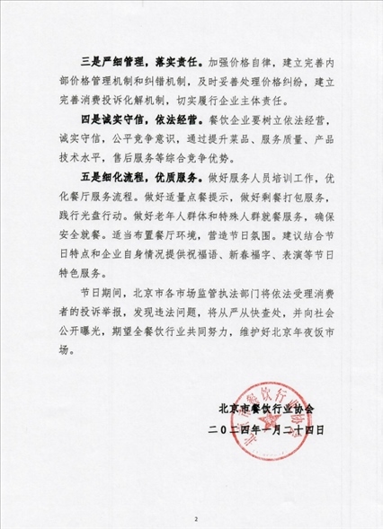 倡議提到,嚴格落實《價格法》《明碼標價和禁止價格欺詐規(guī)定》《規(guī)范促銷行為暫行規(guī)定》等法律法規(guī),不得在標價之外加價出售商品,不得收取任何未予標明的費用,嚴禁“時令價”、嚴禁不標價、嚴禁虛構原價、虛假折扣、低標高結、不履行價格承諾等價格欺詐行為。餐飲企業(yè)年夜飯除提供多種形式的套餐,還應提供適合特殊需求的點餐菜單,為廣大消費者提供便利,滿足不同消費者的需求。