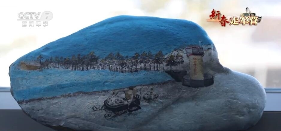 新疆軍區(qū)紅山嘴邊防連 段昱恒:我畫的這塊石頭,這里是我們紅山嘴邊防連的一個哨樓,這里是我們一起來的6名新兵,從哨樓出來準(zhǔn)備去巡邏,前方有冰河,有雪山。在這里我還畫了一條龍,新的一年是龍年,我也希望大家龍馬精神,見龍皆是福。