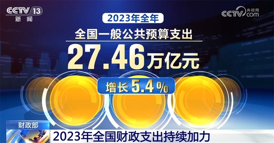 2023年,財(cái)政收入保持恢復(fù)性增長(zhǎng)態(tài)勢(shì),財(cái)政支出持續(xù)加力。具體來(lái)看,去年年初,財(cái)政赤字率按3%安排。同時(shí),為支持災(zāi)后恢復(fù)重建和提升防災(zāi)減災(zāi)救災(zāi)能力,去年四季度增發(fā)1萬(wàn)億元國(guó)債,全部通過(guò)轉(zhuǎn)移支付安排給地方。2023年全年,全國(guó)一般公共預(yù)算支出27.46萬(wàn)億元,增長(zhǎng)5.4%。社會(huì)保障和就業(yè)、教育、科學(xué)技術(shù)、農(nóng)林水、城鄉(xiāng)社區(qū)等重點(diǎn)支出領(lǐng)域保障有力。