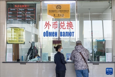 1月30日,在黑河水運口岸出境大廳,工作人員幫助游客辦理外幣兌換業(yè)務(wù)。新華社記者 謝劍飛 攝