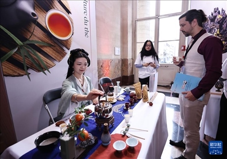 1月30日,在法國巴黎布龍尼亞宮舉行的“你好!中國”旅游推介會上,嘉賓體驗中國茶。新華社記者 高靜 攝