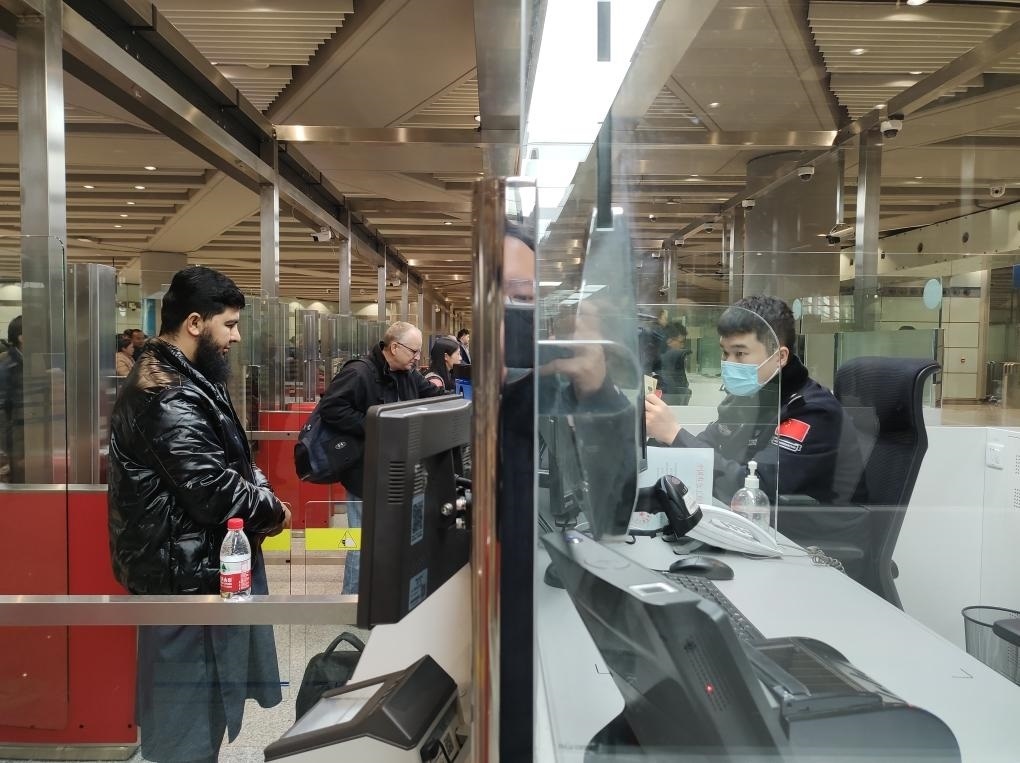 1月2日,北京邊檢總站移民管理警察為入境旅客辦理邊檢手續(xù)。(北京邊檢總站供圖)