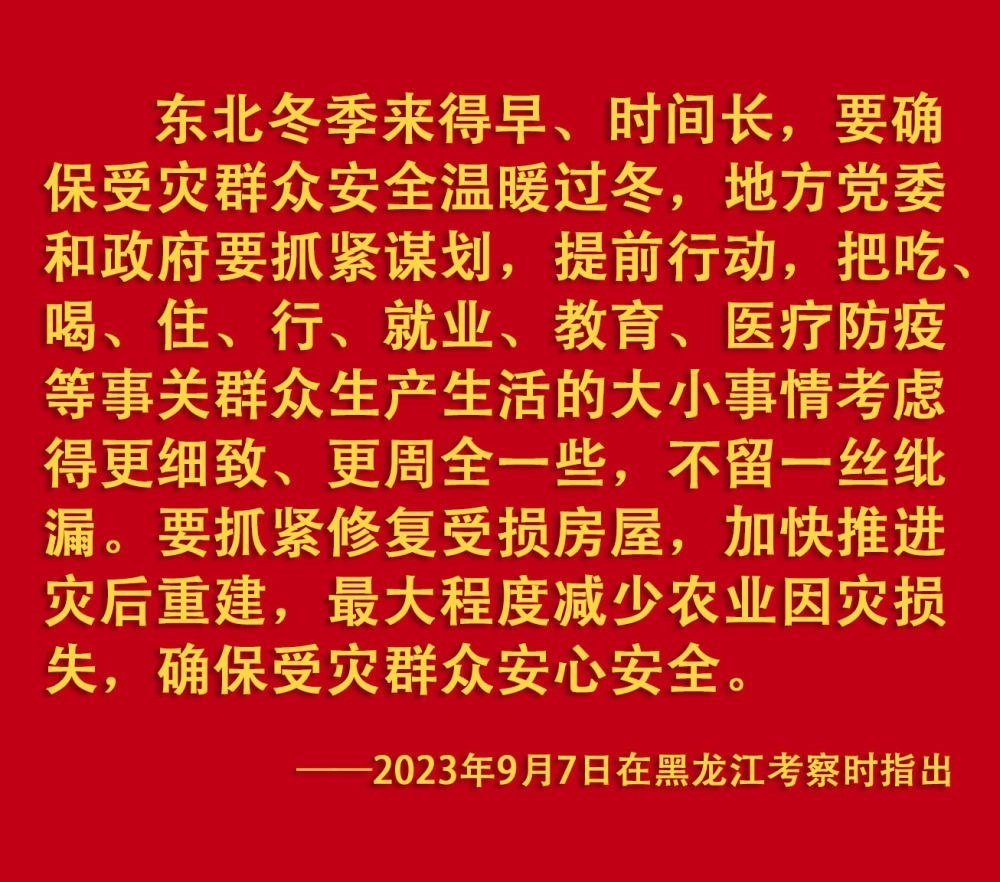 2023年汛期以來,我國華北、東北等地出現(xiàn)極端降雨,引發(fā)洪澇和地質災害。習近平一直牽掛著受災群眾,高度重視防汛抗洪救災和災后恢復重建工作,多次作出重要指示批示,要求有關地方和部門全力保障人民群眾生命財產安全,盡快恢復災區(qū)正常生產生活秩序。2023年9月上旬,習近平前往黑龍江尚志市看望慰問受災群眾;11月,北方入冬之際,習近平又來到北京、河北受災較重的相關地區(qū),看望慰問受災群眾,檢查指導災后恢復重建工作。