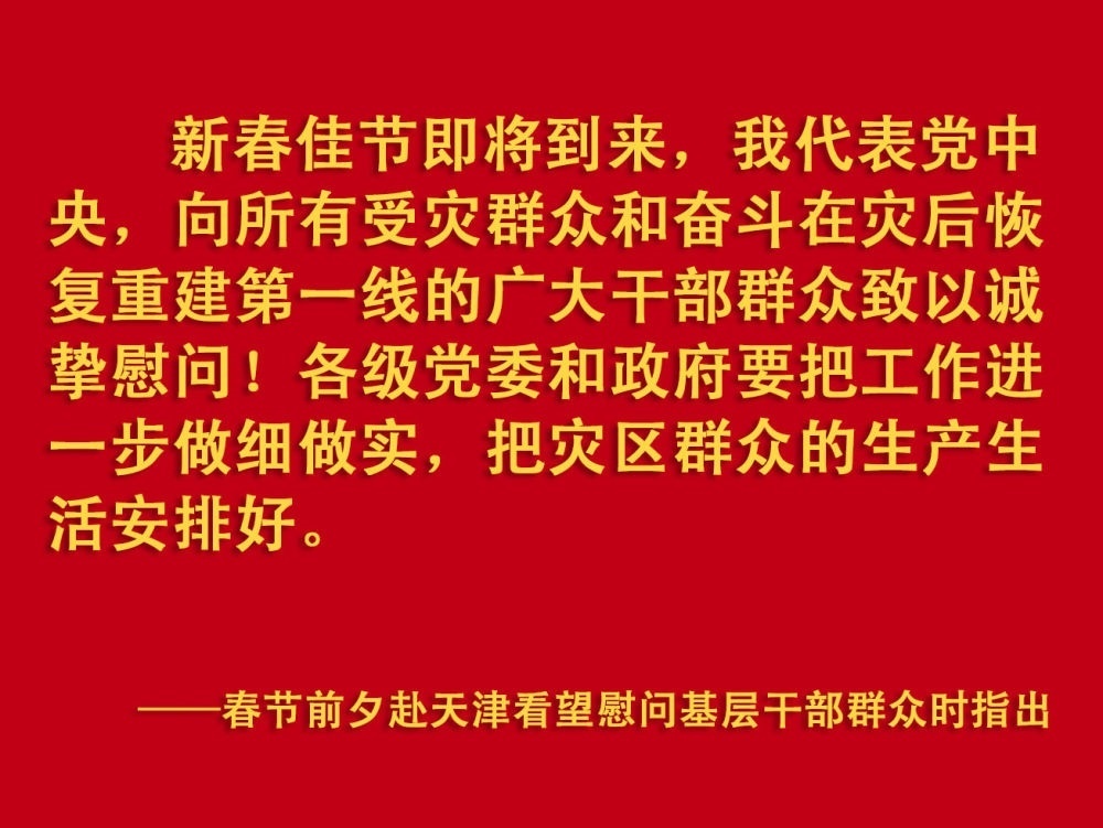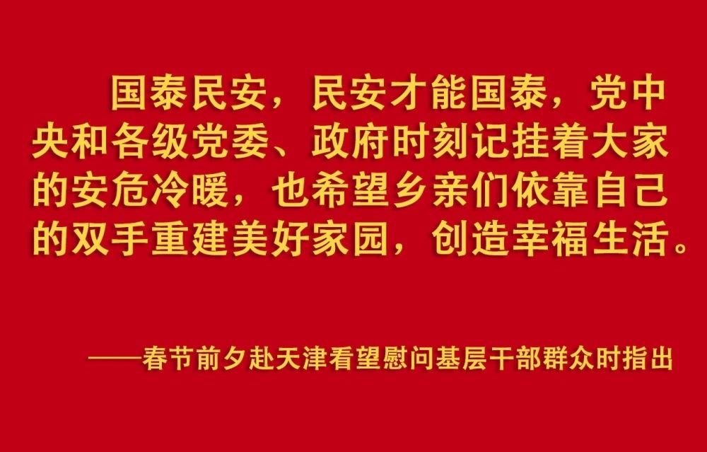 春節(jié)前夕,習近平總書記在天津考察調研,看望慰問基層干部群眾。2月1日上午,他首先來到西青區(qū)辛口鎮(zhèn)第六埠村,實地了解去年洪澇災害后當?shù)剞r業(yè)生產恢復等情況,看望受災群眾。