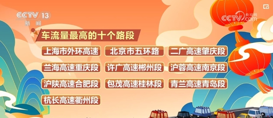 這兩天,2024年春運開始后高速公路迎來第一輪高峰。根據千方科技利用公路流量監(jiān)測數據的預測,車流量最高的十個路段是:上海市外環(huán)高速、北京市五環(huán)路、二廣高速肇慶段、蘭海高速重慶段、許廣高速郴州段、滬蓉高速南京段、滬陜高速合肥段、包茂高速桂林段、青蘭高速青島段、杭長高速衢州段。