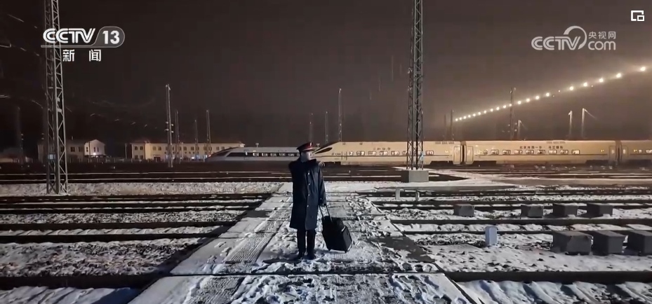 趁著茫茫夜色,動(dòng)車組司機(jī)張洋從動(dòng)車所出勤,執(zhí)行當(dāng)天高鐵第一列“熱滑除冰車”的執(zhí)勤任務(wù)。