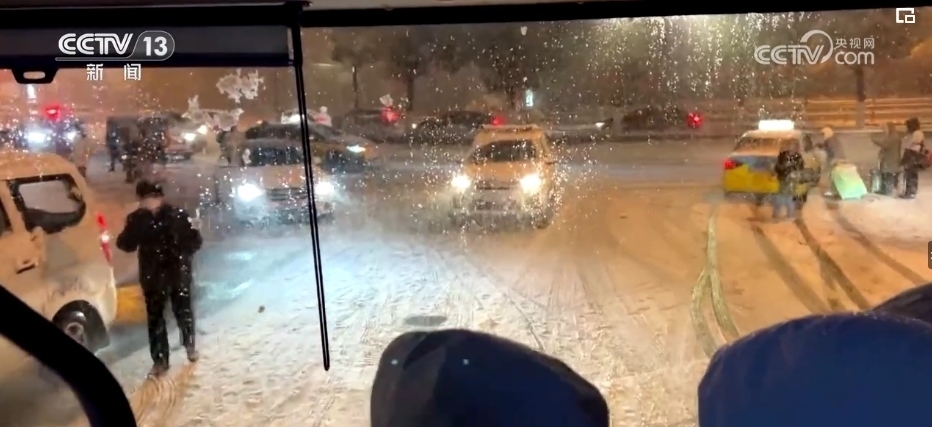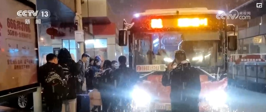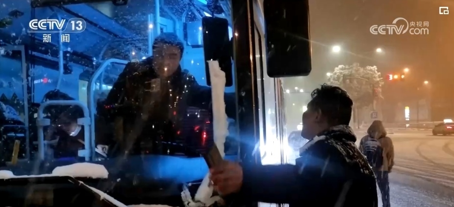 看到一些帶著小孩和老人的乘客沒能擠上車,站在風(fēng)雪中焦急等候,黃勁松和隊(duì)友們走上前,帶著他們前往公交站場,提前上車等候發(fā)班。凌晨1時(shí)10分,第二趟加班車從車場出發(fā)了。