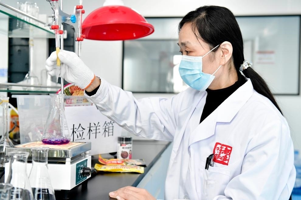 工作人員在樂(lè)陵市調(diào)味品產(chǎn)業(yè)共享實(shí)驗(yàn)室對(duì)送樣調(diào)味品進(jìn)行檢測(cè)。新華社記者 郭緒雷 攝
