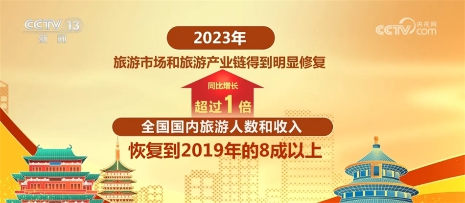2023年,旅游市場(chǎng)和旅游產(chǎn)業(yè)鏈得到明顯修復(fù),全國(guó)國(guó)內(nèi)旅游人數(shù)和收入同比增長(zhǎng)超過(guò)1倍,恢復(fù)到2019年的8成以上;入出境旅游人數(shù)超過(guò)1.9億人次,較上一年增長(zhǎng)2.8倍以上。