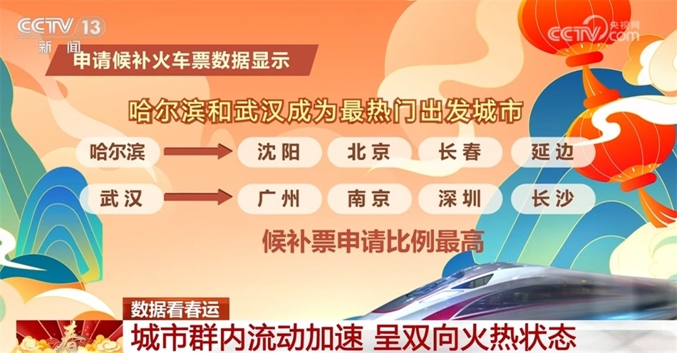 從申請候補(bǔ)火車票的熱門城市看,哈爾濱和武漢延續(xù)昨天的熱度,繼續(xù)成為今天候補(bǔ)票里最熱門的出發(fā)城市,從哈爾濱到沈陽、北京、長春、延邊,從武漢到廣州、南京、深圳、長沙的候補(bǔ)票的申請比例最高。提醒有候補(bǔ)票需求的旅客,合理安排出行。