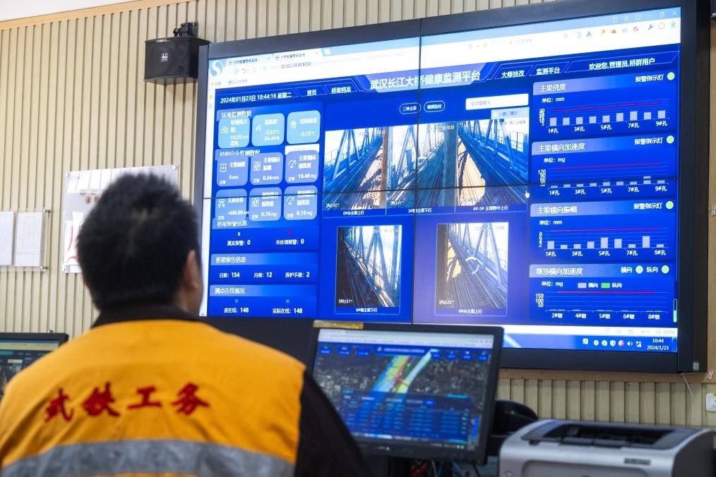 進(jìn)入高鐵時(shí)代,隨著技術(shù)的發(fā)展與進(jìn)步,大橋養(yǎng)修標(biāo)準(zhǔn)提升,養(yǎng)護(hù)水平不斷提高。在武漢長(zhǎng)江大橋橋梁車間辦公樓一樓的主控室,大屏上顯示著大橋數(shù)十處關(guān)鍵處所監(jiān)控畫面,大橋上橋梁防撞監(jiān)控系統(tǒng)和橋梁健康監(jiān)測(cè)系統(tǒng)的各項(xiàng)數(shù)據(jù)實(shí)時(shí)更新。